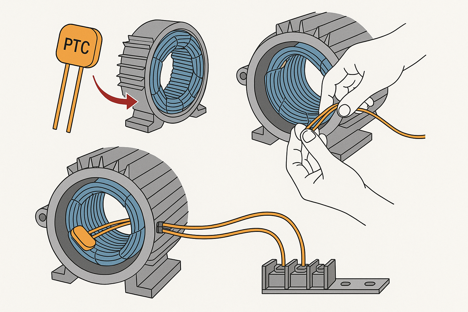 Cố định và dẫn dây cảm biến: Sau khi chèn cảm biến PTC, khâu lacing lại phần đầu cuộn dây theo yêu cầu khoảng cách cách điện. Đảm bảo rằng cảm biến nằm hoàn toàn giữa cuộn dây và các dây quấn quấn xung quanh, không có khe hở, để truyền nhiệt tốt nhất. Dùng dây buộc và băng dính nhiệt chuyên dụng để cố định dây dẫn PTC, tránh uốn gấp mạnh hoặc lỏng lẻo. Để dây PTC chạy qua một khối đấu nối riêng (terminal block) nhằm giữ cách ly với các dây cuộn động cơ khác.
