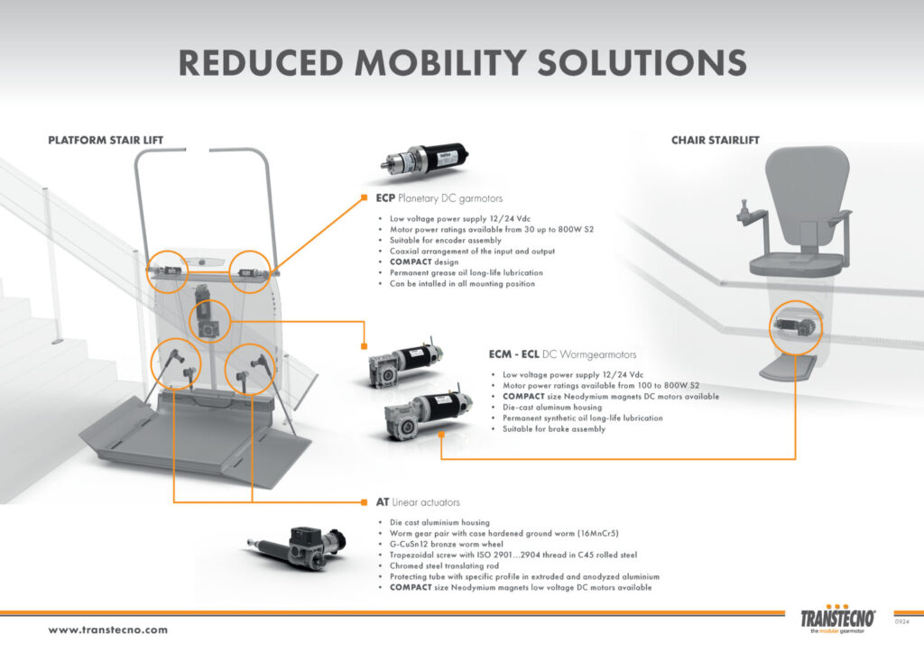 Động cơ giảm tốc Transtecno (gearmotor) và cơ cấu truyền động tuyến tính (linear actuator) là những bộ phận quan trọng trong các thiết bị nâng hỗ trợ người khuyết tật, như sàn nâng xe lăn và ghế cầu thang. Các thiết bị này chuyển đổi năng lượng điện thành chuyển động cơ học, giúp vận hành ổn định, an toàn và tin cậy.