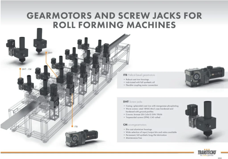 Trong khi động cơ giảm tốc Transtecno cung cấp công suất cho các con lăn, thì kích trục vít thường được sử dụng cho các nhiệm vụ điều chỉnh và định vị trong máy cán định hình. Những bộ truyền động điện – cơ này biến chuyển động quay thành chuyển động tịnh tiến.