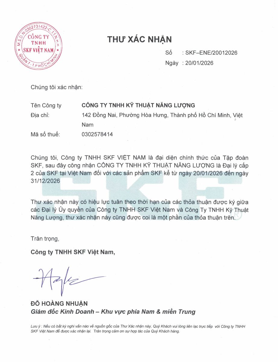 Kể từ ngày 20/01/2026, Công ty TNHH Kỹ Thuật Năng Lượng vinh dự là đại lý chính thức cấp 2 phân phối bạc đạn SKF chính hãng tại Việt Nam. Chuyên cung cấp các vòng bi - ổ lăn SKF phục vụ cho nhà máy, khu công nghiệp và các hệ thống thiết bị quay trong nhiều lĩnh vực sản xuất.