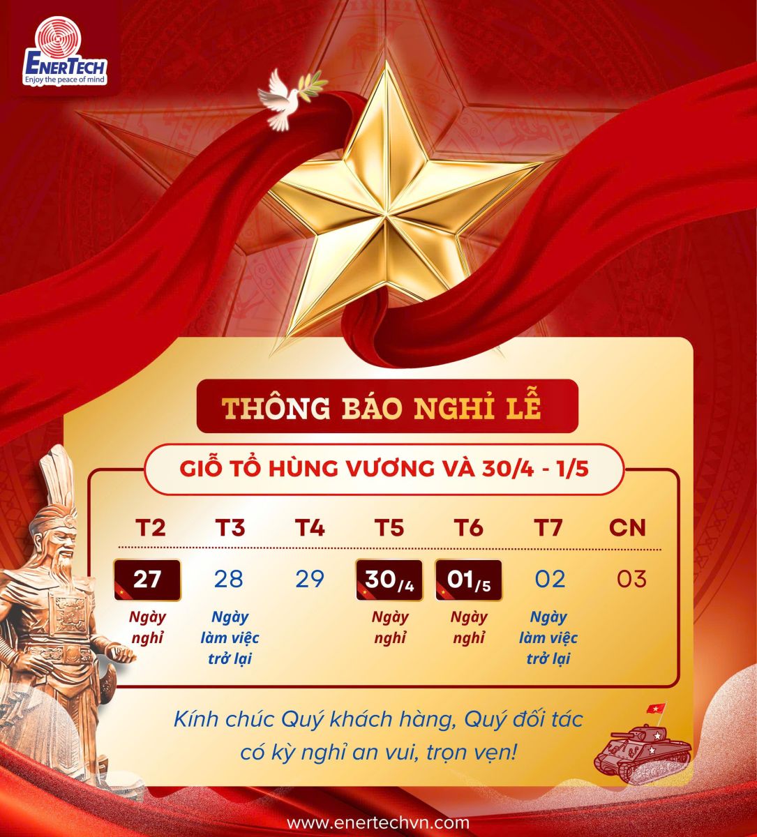 Kỹ Thuật Năng Lượng xin gửi đến Quý Khách hàng và Quý Đối tác thông tin lịch nghỉ lễ nhân dịp: Giỗ Tổ Hùng Vương (10/3 ÂL), Ngày Giải phóng miền Nam (30/04) và Quốc tế Lao động (01/05) như sau: