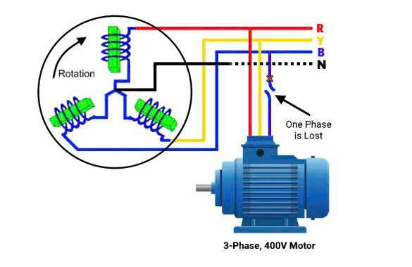 Như vậy, nếu động cơ vẫn chạy ở tải định mức khi mất một pha, tốc độ sẽ giảm, cuộn dây nóng rất nhanh, và theo thời gian sẽ làm cháy cuộn dây.